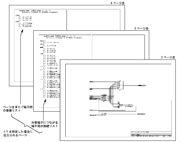 Yを指定すると,外部端子からの接続リスト,およびページをまたぐ端子間の接続リスト(ただし,2端子間のみの接続は図面中で直接指示されるので除く)を作成し,PostScriptファイルに追加します(デフォルトは N)
