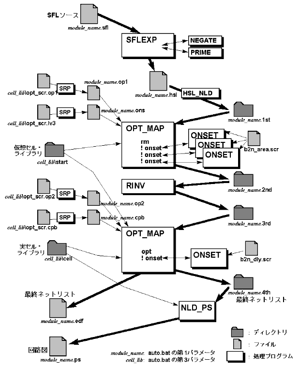 (1) まず,論理合成プログラム SFLEXP が起動され,SFLソースの module_name.sfl から,HSL形式のネットリスト module_name.hsl が合成されます.