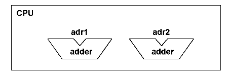 階層表現をするとき,下位のモジュールの1個1個(インスタンス)をサブモジュールと呼びます.たとえば図3.1 のような構成のとき「CPU というモジュール(部品種)は adder というモジュール(部品種)をサブモジュール(部品)として 2個使っていて,その名前(インスタンス名)は adr1,adr2 です.」といいます.