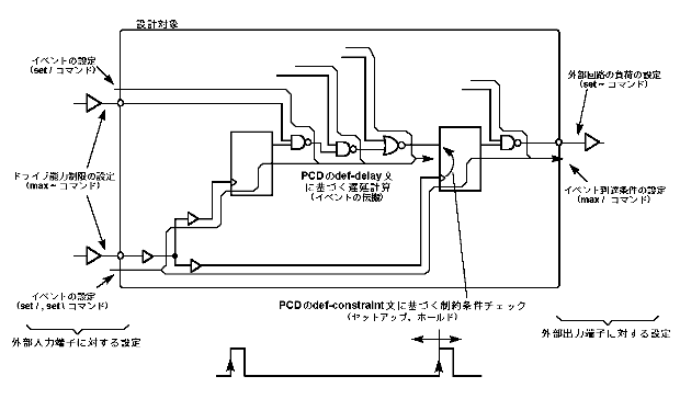 また,セル・ライブラリに存在する各PCDファイルには,そのセルが正常に動作するための条件が def-constraint文(4.2を参照のこと)によって記述されており,OPT_MAPが回路を構築した場合,その条件が,対応する各PCDモジュールにおける制約条件とみなされます.OPT_MAPが認識する制約条件とは,この各PCDモジュールにおける制約条件と,上記の(1),(4)の外部端子における制約条件がすべてになります.