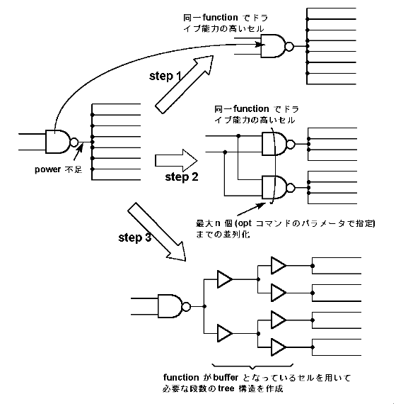 なお,バッファ挿入のためには,機能が "buffer" および "clock_buf" であり,入力端子から出力端子への該当イベントの遅延伝搬が可能なセルが,指定したセル・ライブラリに準備されている必要があります.