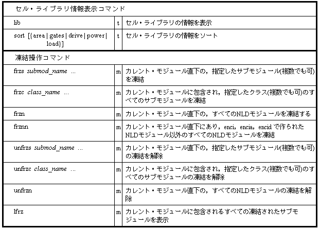 凍結の機能は,すでに用意されているハード・マクロの回路を部品として使用する回路の論理合成の際などに役立ちます.凍結されたサブモジュールは,unfrzc または unfrzs コマンドによって,凍結されていない状態に戻ります.