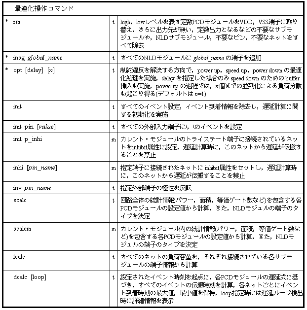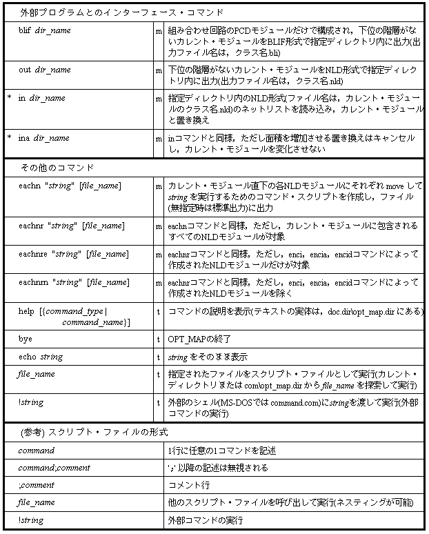 そのほかにOPT_MAPは,階層構成の制御機能,部分回路の置換機能,冗長回路の除去機能,各種の物理的特性(遅延時間,負荷容量,面積など)の評価機能など数多くの機能をもっており,これらの動作は,OPT_MAPに与えられるコマンドによって制御されます.