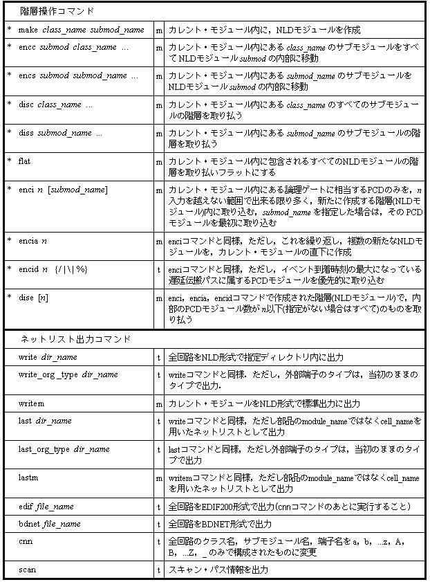 また,部分的に回路をくくり出して,外部の ONSETなどの処理を適用させ,その結果の回路を元の部分回路と置き換えて取り込むといった処理の際にも階層制御コマンドが使われます.この場合には,enciaコマンドなどによって対象部分を一時的にNLDモジュールによって囲い込む,すなわち一時的な階層を作り出すという処理が実施されることになります.