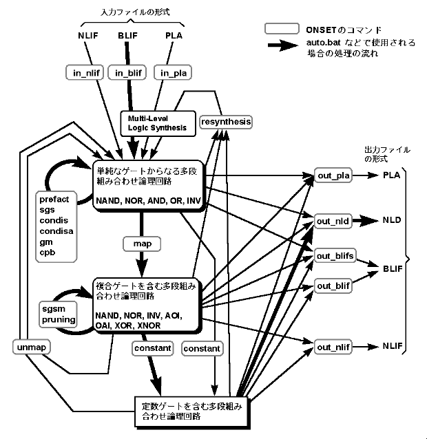 ONSET (Optimizer for logic Networks Supported by Extension of Transduction method) は,組み合わせ論理回路の強力な簡単化プログラムであり,以下の機能をもっています.