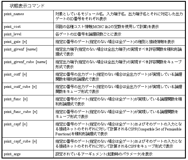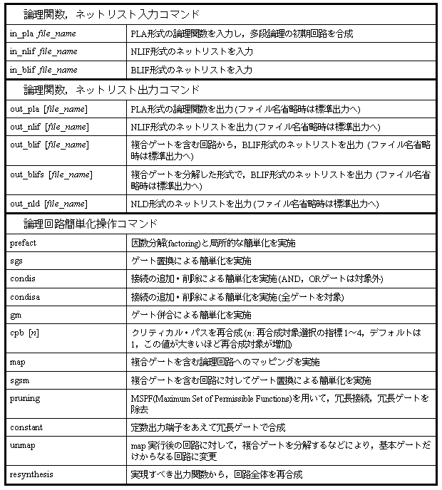 論理回路簡単化操作コマンドや,論理関数,ネットリスト入力コマンドについては,対象とする論理回路の性質によって,小規模であっても極端に実行時間を要する場合があります.