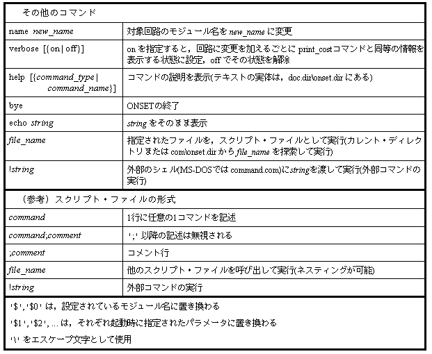ONSETのコマンド一覧を表8.1に示します.各コマンドごとのより詳しい説明は,helpコマンドによるオンライン・ヘルプ機能によって,表示させることができます(MS-DOSの more.com がONSETから呼び出される).