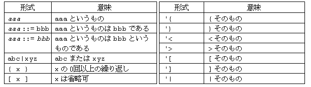 以下に SFL言語の形式を示します.形式の表記には表3.5 の BNF (Backus-Naur Form) 表記法を用いています.これによると,たとえば {x1|x2|x3} は「x1 または x2 または x3 が 0 回以上繰り返されること」を,[x1|x2|x3] は「x1 または x2 または x3 が省略され得ること」を表しています.
