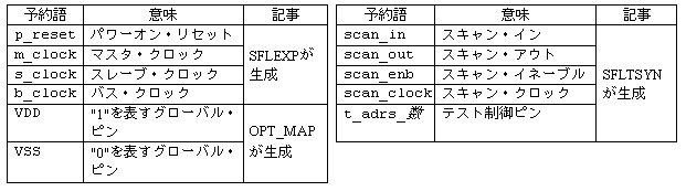 予約語 は合成された回路の中で固定的に使われる外部端子の名称です.表3.6 に簡単な説明と,どのプログラムが生成するかをまとめました(表右側のスキャンおよびテスト関係の予約語は,ワークステーション版 PARTHENONに備わっているテスト合成機能の使用時に有意となる).SFLEXPが生成するリセットとクロック関係の端子がどう使われるかは,6.3節を参照して下さい.なお,キーワード や予約語 と同じ名前 は使用できません.
