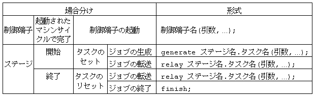 ステージのタスクは,「他の動作主体からジョブの生成またはジョブの転送を受けるとセット」され,「そのステージ自身のジョブの転送あるいはジョブの終了によりリセット」されます.つまりステージの起動はタスクのセットにより行うということです.ここで制御端子やステージの起動の方法をまとめると表3.1 のようになります.